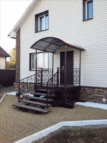 Возможно купить или заказать под ваш размер небольшое приставное крыльцо из металла к дому или к дачному деревянному домику, отделанное террасной доской или с использованием дерева лиственных пород. Перила можно использовать металлические с деревянным поручнем или полностью из металла с элементами ковки.