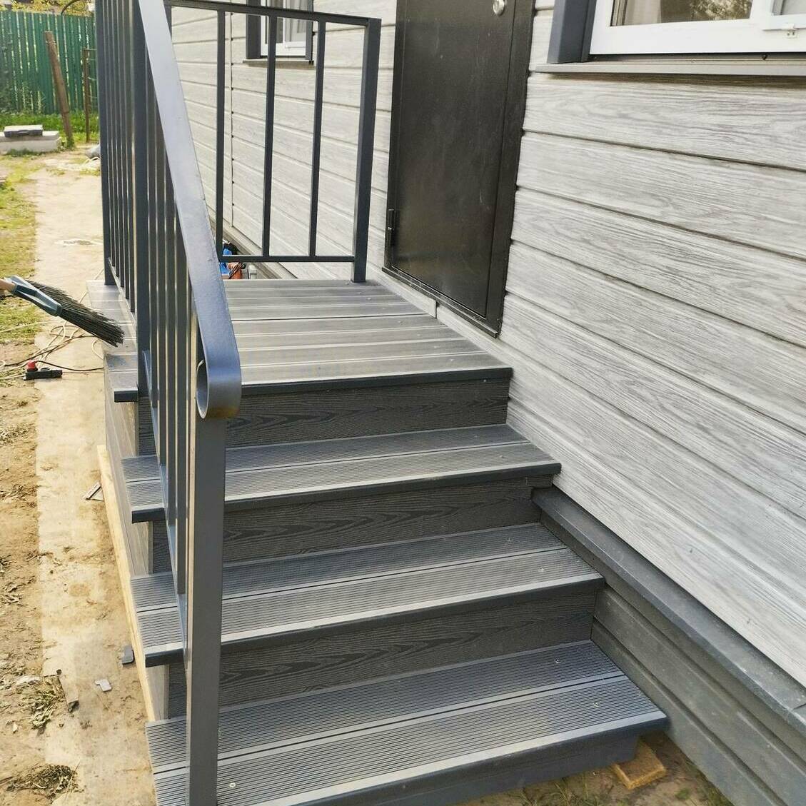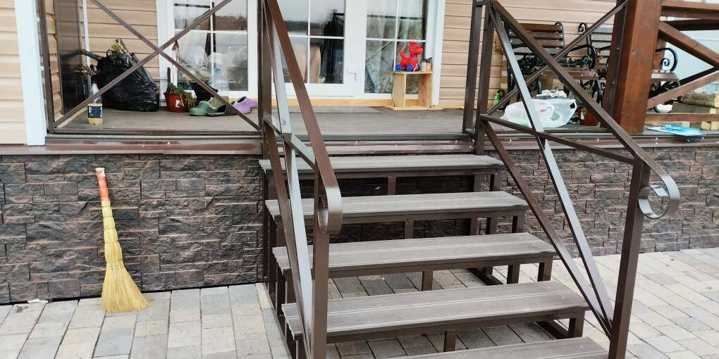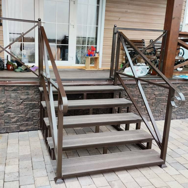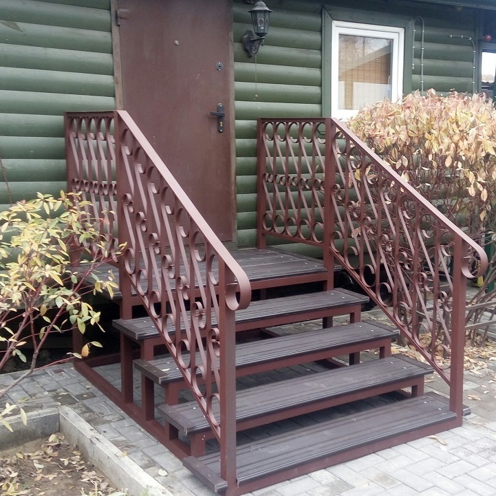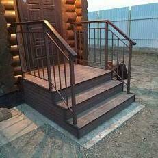 Возможно купить или заказать под ваш размер небольшое приставное крыльцо из металла к дому или к дачному деревянному домику, отделанное террасной доской или с использованием дерева лиственных пород. Перила можно использовать металлические с деревянным поручнем или полностью из металла с элементами ковки.