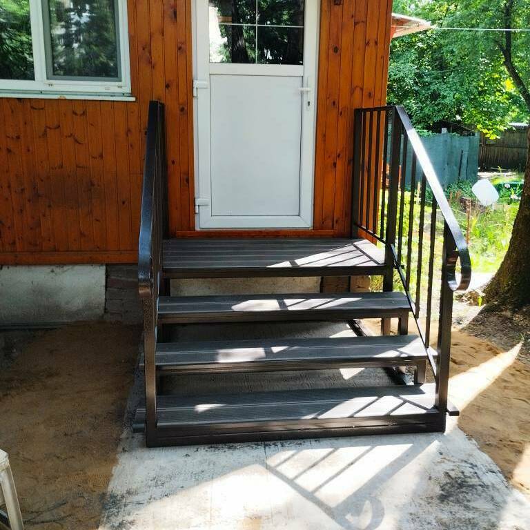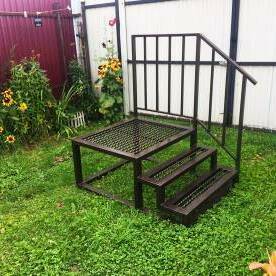 Нет готовой бетонной площадки. Не беда. Установим крыльцо из металла на винтовые сваи. Сваи буду служить опорой крыльца. Заказывайте изготовим под ключ.